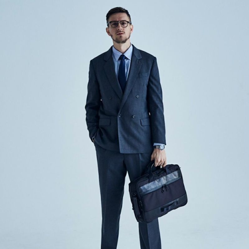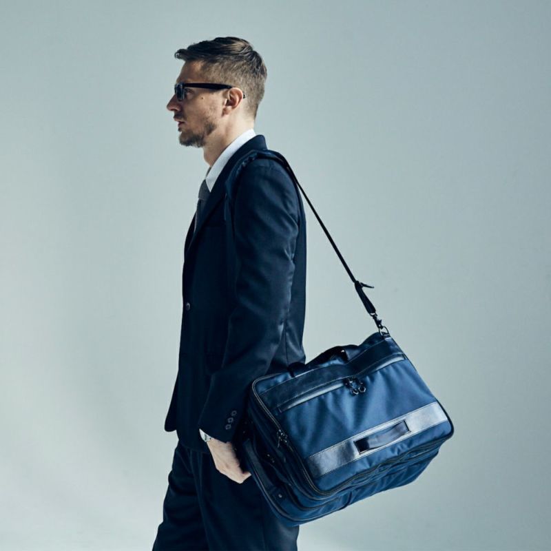 機能的なビジネスBAGとしての十分な性能に加え、脱着式のガーメントケースを備えた大容量のこのモデルは、シチュエーションによって本体のサイズと重量を調整できる革新性で、ビジネスBAGの新境地を切り開きます。(2層式に変換した場合のマチ幅は、150㎜・重量は1,200gとなります。)