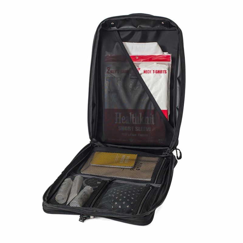 2方向からの収納と15.6インチまでのサイズに対応するPCスリーブ。効率的な仕分け収納を実現する各コンパートメント内のオーガナイザー。8リッターの容量で着替えや私物を収納できる脱着式のガーメントケース。身体にフィットするカーブを描くショルダーハーネス。キャスターバックのハンドルに固定できる本体背面のループ。ショルダーベルト付属。