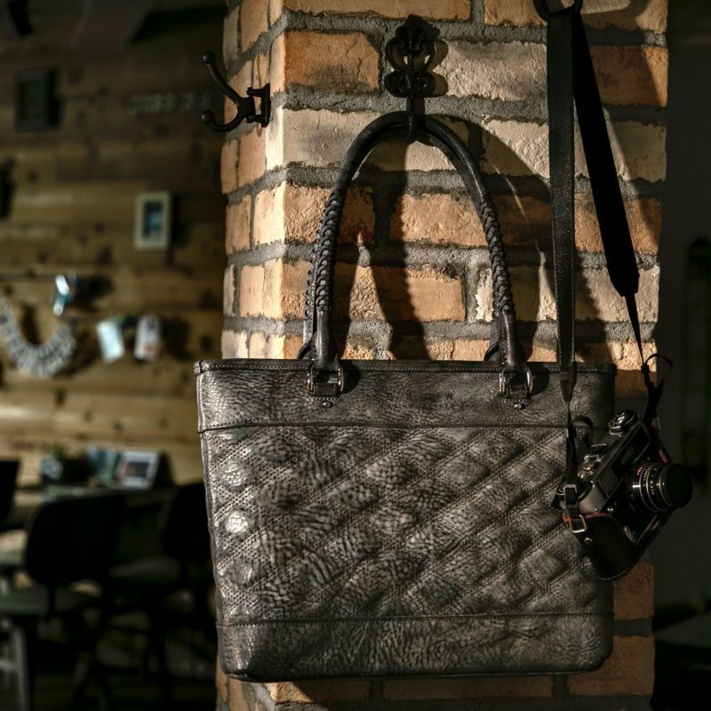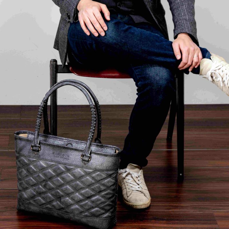 本製品では革のエイジングを楽しんでいただく為に、長年の使用に耐えられる作りにしています。特徴的な格子柄の胴面デザイン部分にコシのある芯材を縫いこみ、長期使用による鞄の型崩れなどが起きない作りになっています。同時に衝撃緩和による内容物の保護も目的としており、パソコンやタブレットなどの電子機器の破損を起こさせないようにしています。またお会計の際や電車内など、又は内容物に合わせて使い分けが出来る様に、鞄に2種類の開閉方法を備え付けています。1つが一般的なファスナーによる開閉方法と、2つ目がファスナー箇所の上部に備え付けられた、隠しマグネットによる簡易的な開閉です。