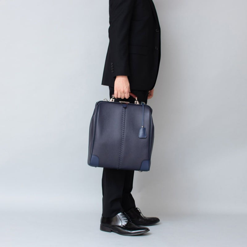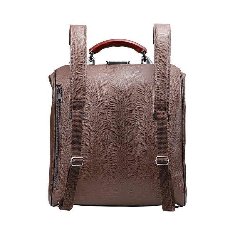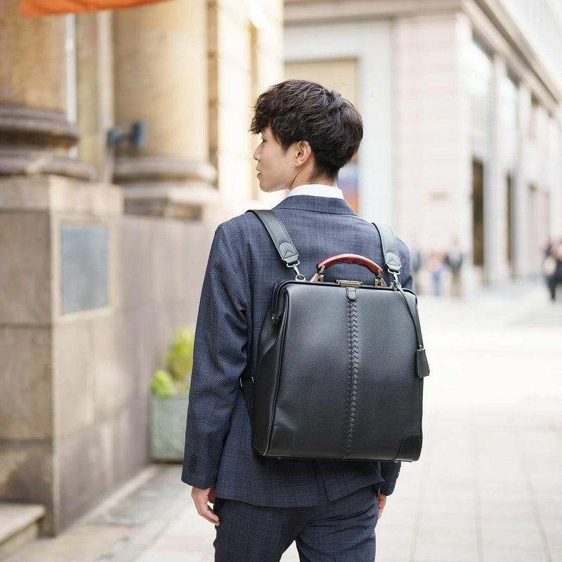 クラシックスタイルの定番型であるダレスBAGをブラッシュアップして、移動に便利なリュック機能を加えました。また、ハンドルは、贅沢に欅(ケヤキ)を使用し、上品な質感と高級感のあるデザインに仕上げています。ショルダーバッグとしてもご使用いただけますが、デザイナーとしては、リュック持ちをお勧めします。持っていても、置いていても存在感のある鞄です。