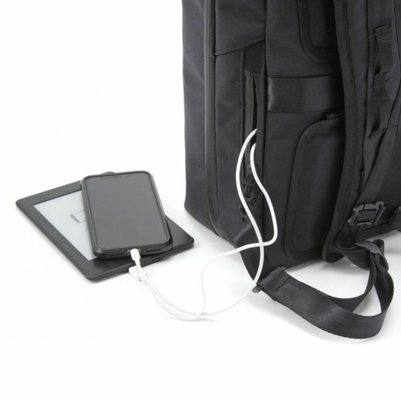 鞄の前面は無駄な装飾を一切省いたシンプルな形状。外装ポケットは両側面後ろ側に配置されているが、このポケットが実に考えられている。移動中に鞄を背負ったまま片手でファスナーを開けて荷物を取り出せ、さらに、内装ポケットに収めたモバイルバッテリーをケーブルで繋いだ状態で、スマホをポケットから出して操作ができるのだ。