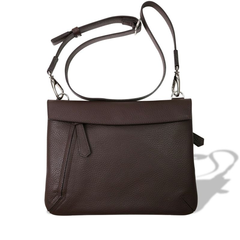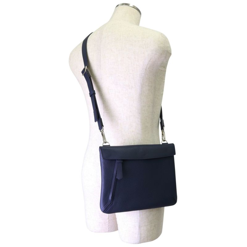 スマートなフラップのデザイン。3か所の隠しマグネットで開閉できる。鞄を開けると、グレーのスエード調生地に縫着されたブランドロゴが目に飛び込む。A5サイズの手帳をゆったり収納できて、スマートフォン等を収めるオープンポケットを装備。前胴・背胴両面にファスナー式外ポケットも備え小物の整理が容易。