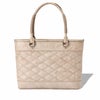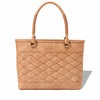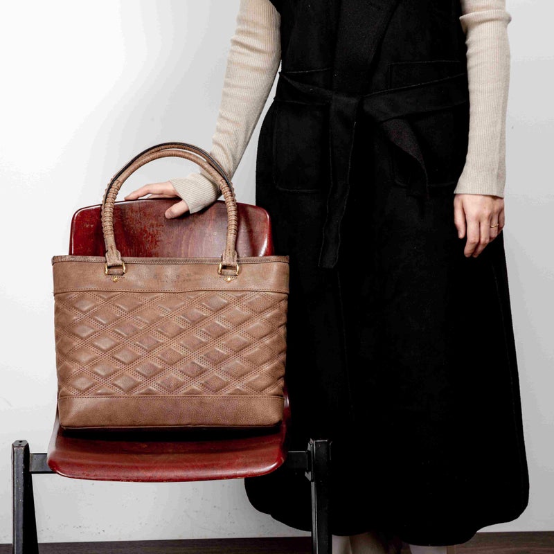 本製品では革のエイジングを楽しんでいただく為に、長年の使用に耐えられる作りにしています。特徴的な格子柄の胴面デザイン部分にコシのある芯材を縫いこみ、長期使用による鞄の型崩れなどが起きない作りになっています。同時に衝撃緩和による内容物の保護も目的としており、パソコンやタブレットなどの電子機器の破損を起こさせないようにしています。またお会計の際や電車内など、又は内容物に合わせて使い分けが出来る様に、鞄に2種類の開閉方法を備え付けています。1つが一般的なファスナーによる開閉方法と、2つ目がファスナー箇所の上部に備え付けられた、隠しマグネットによる簡易的な開閉です。