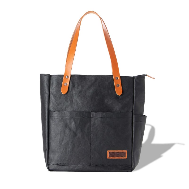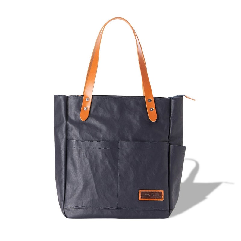 シンプルなデザインに機能性をプラスした縦型のタウントートです。 A4ファイル収納対応でもスリムなフォルム。使い勝手の良い肩掛けトートバッグです。外装は表面にPVC加工を施した帆布。しっかりとしたコシがあり水濡れやスクラッチにも強い。ハンドルとロゴには、大量生産が難しく希少価値の高い栃木レザーの牛革を使用。味わいのある革が鞄を引き締めます。