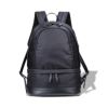 メインファスナーと下段ファスナーには雨蓋を付け、背胴側(サブルーム)のファスナーには止水ファスナーを使用し、雨等の水に濡れても染み込みにくい設計にしています。メインファスナーと下段のファスナーどちらからでも出し入れできる仕様ですが、下段ファスナーの上部(内側)に仕切りを付け、ファスナーを閉じると部屋が2つに分かれます。たとえばレッスン時などに、着替えとシューズ・タオル等の収納場所を仕分けできます。