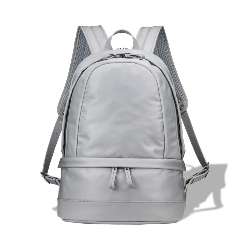 本体生地は、高密度のナイロンツイル(綾織)です。高級感且つ上品な艶感が特徴です。表面は、きめ細かく繊細に見えますが、66ナイロン糸を使用し、裏加工にソフトアクリルコーティングを施していますので引き裂き強度に優れています。その上、裏側にスムース編み(インターロック)の生地(Tシャツの様な薄い生地)を貼り付け、張り感とシルキーなタッチとソフト感を加えました。ナイロン素材のため軽量で、日常の使用では色落ちしません。弱撥水性がございます。パーツに使用している革も、顔料仕上げのため色落ちしにくい仕様です。