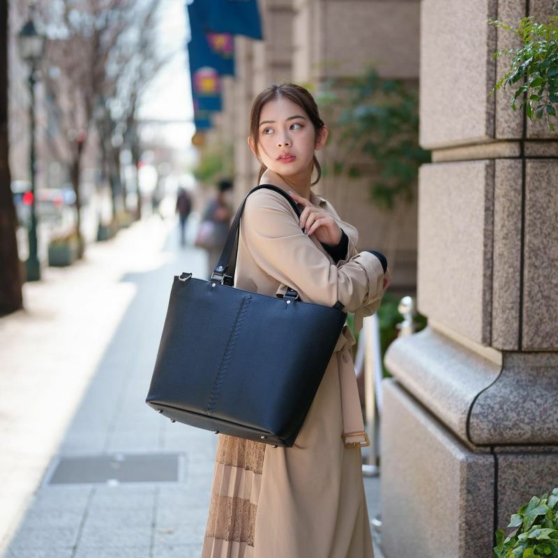ダレスバックをメインで制作しております東京発信の「YOUTA」と豊岡鞄のダブルネームです。PC、書類、プライベートの荷物を仕分け出来る3層トートです。オン、オフ兼用で使用でき収納ポケットも各用途にあわせて取付しているので万能型トートになっております。メイン生地はリザードの型押しPVC、ハンドルに革を使用し上品な質感と高級感あるデザインにしております。
