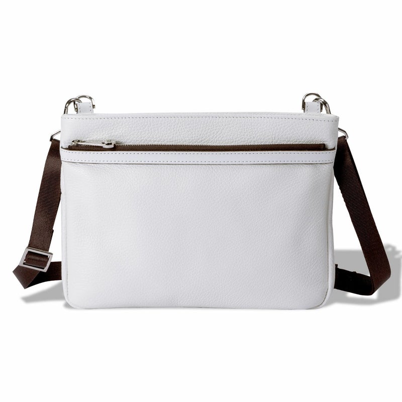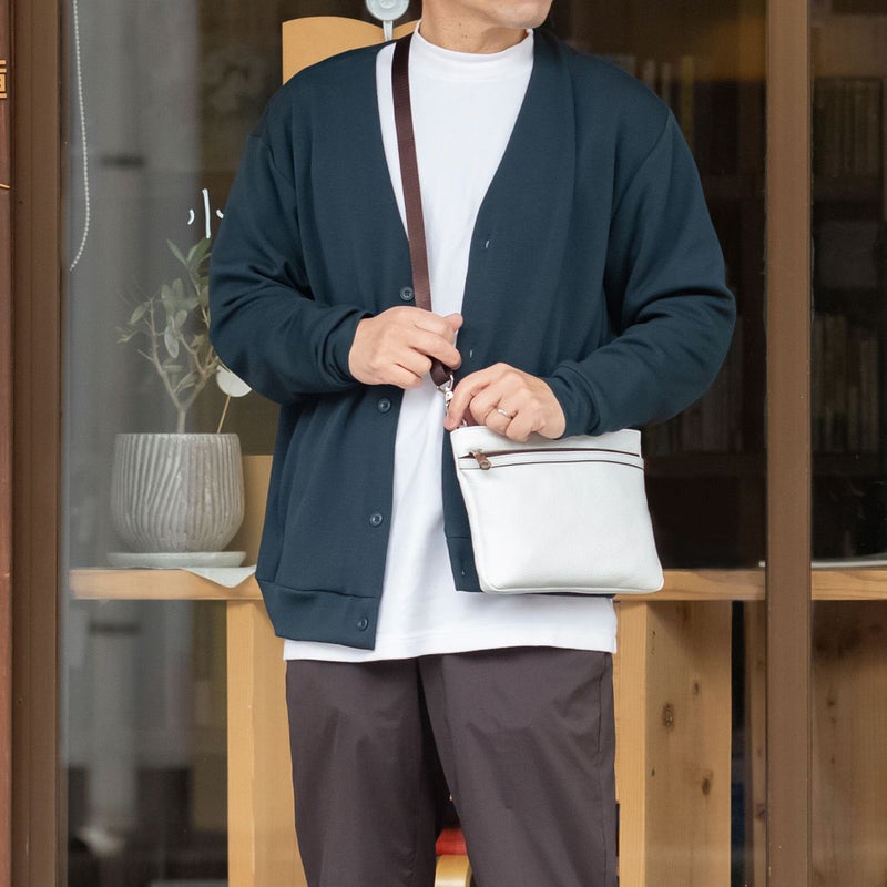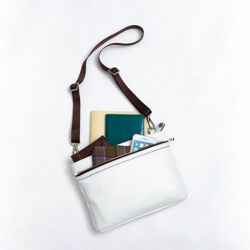 カジュアルなサコッシュも、純白レザーとメタルパーツで大人仕様に。